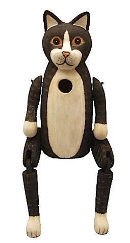 Dangle Cat wooden birdhouse with jointed limbs is One Tall Cat to house your feathered friends in high style! Expressive, whimsical and functional, this hand painted bird house has a hidden trap door for easy clean-out. Entrance hole is 1.5″ and is perfect for small to medium size songbirds. Fun bird house provides a cozy nest site and swell roosting spot for cold winter nights. Complete with screw-eye hook and heavy hemp rope for easy hanging.
