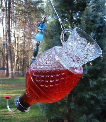 Innovative hanger has looped top for easy placement, while the bias design allows the hummingbird feeder to hang at an angle. Teacup accessory on this pretty feeder may be left empty, hold water, or used for fruit to attract fruit flies (a great protein source for hummingbirds). Â