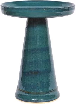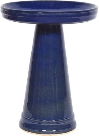 Tall bird bath with rich blue glaze features lock-on top and fine craftsmanship. Handmade pottery with a clean design that suits any landscape, perfect size for deck, balcony or patio too.
