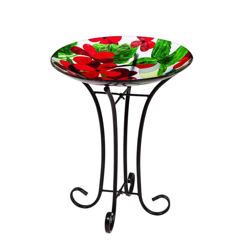 Glass Bowl: 16-inch diameter bath features vivid color with gentle walk-in for birds’ comfort, also accommodates a heater in winter.
