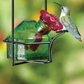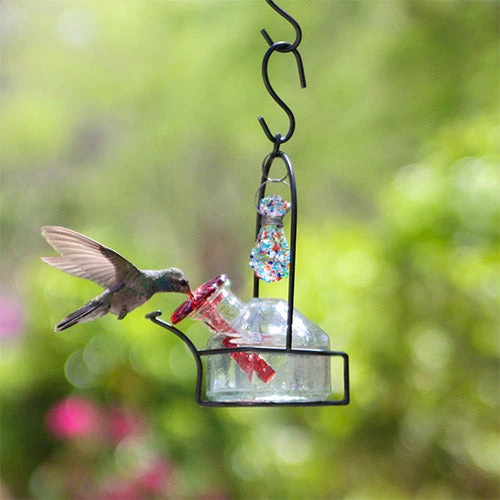 Unique hand-blown glass feeder features powder coat metal hanger with perch design, includes s-hook for easy hanging. Top fill feeders won’t drip or leak, simple to fill and clean too. Both red and clear nectar look beautiful in the clear vessel.