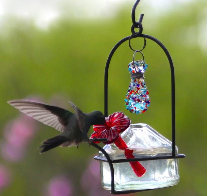 Clear glass hummingbird feeder with crystal droplet sparkles in the sun to attract tiny sprites!