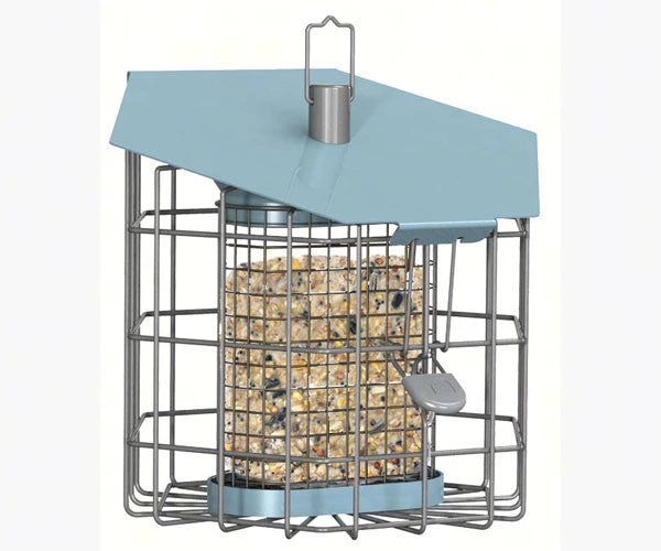 Caged suet feeder foils squirrels beautifully, compact design is ideal for small spaces!