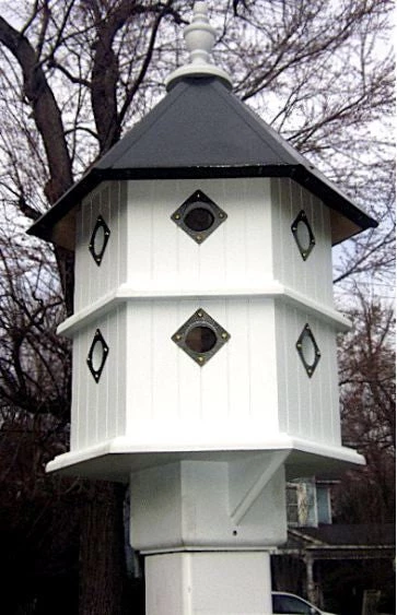 Stately dovecote birdhouse features unsurpassed quality, with twelve nesting apartments, each protected by a metal predator guard. Over two feet tall, it stands on a 15″ hexagon vinyl base with attached mounting collar that fits right on your 4×4 post.