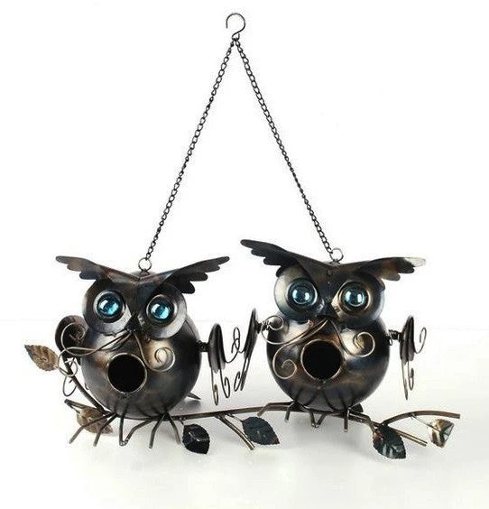 Perched upon a decorative branch, with piercing jewel blue eyes, the whimsical owls welcome chickadees, titmice, wrens and other small songbirds with two nesting spots.