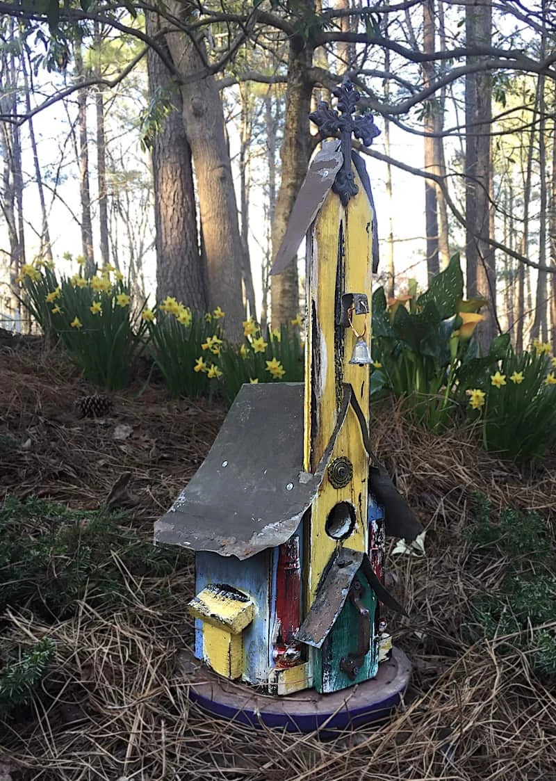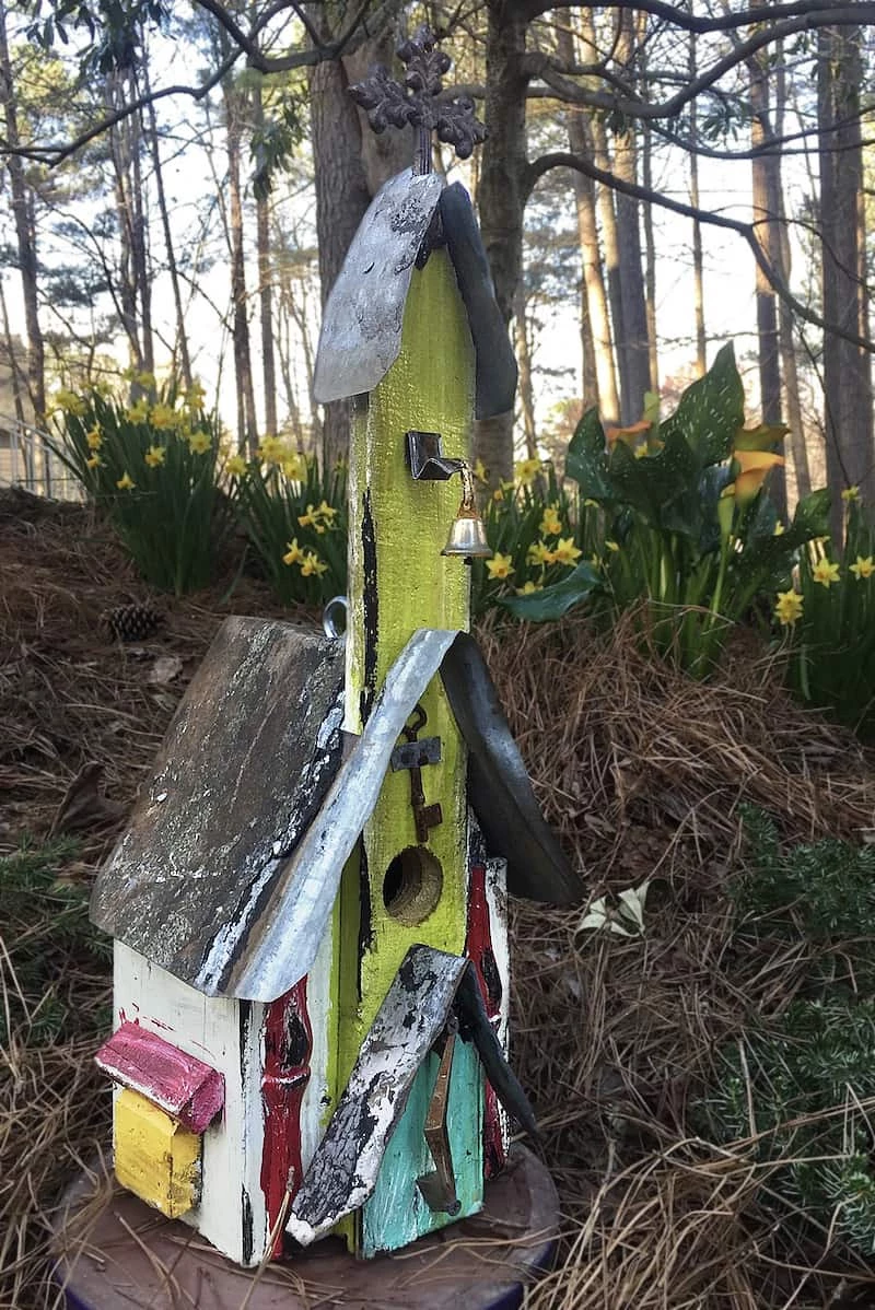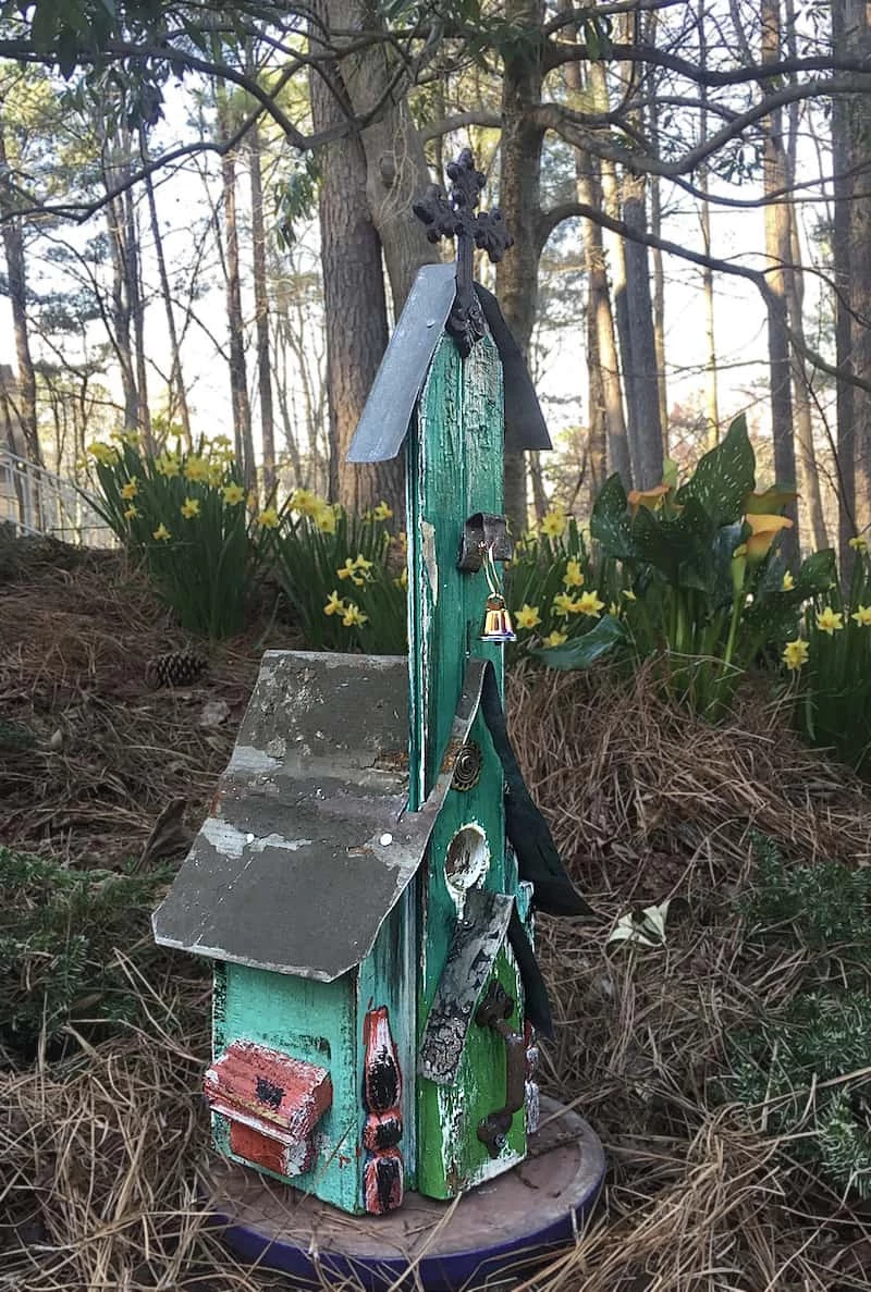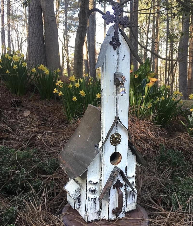 Handmade in Georgia from reclaimed materials, these birdhouses boast 50+ year old wood painted with unique style. Church bird house is functional art for the landscape, providing your birds a cozy nesting site in spring and roosting spot throughout the year.