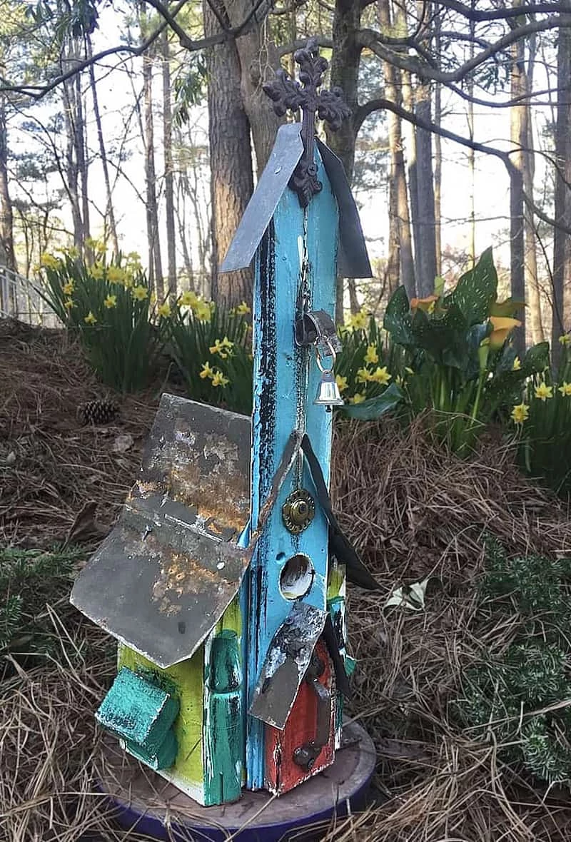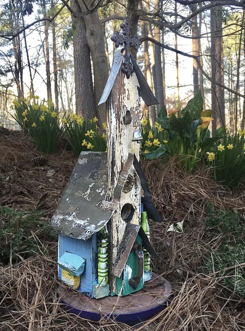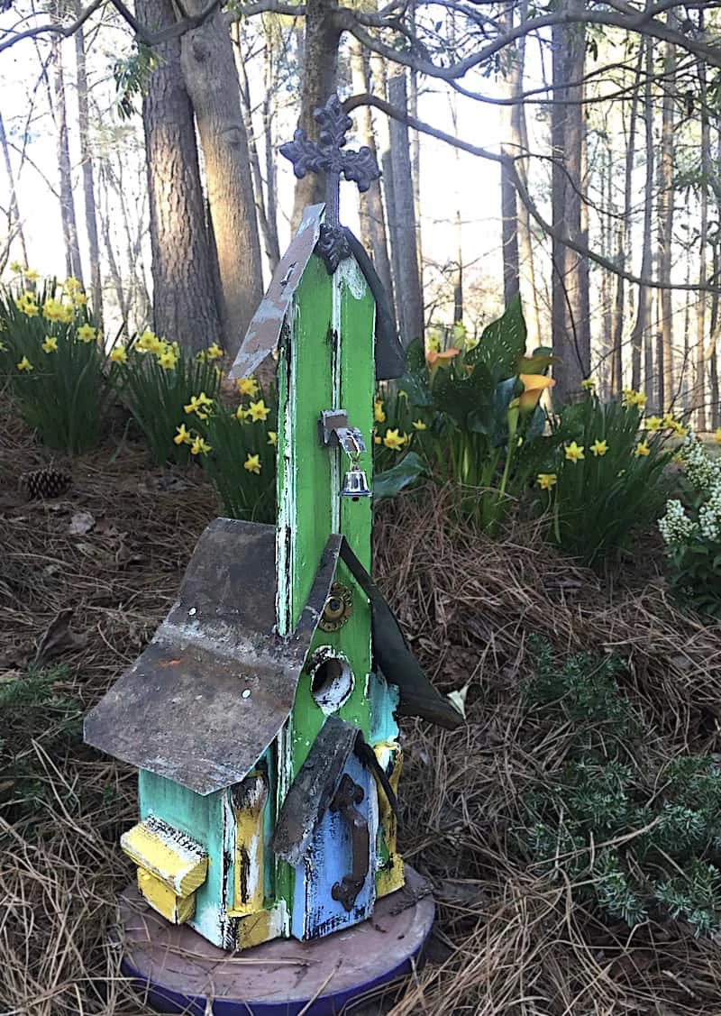 Handmade in Georgia from reclaimed materials, these birdhouses boast 50+ year old wood painted with unique style. Church bird house is functional art for the landscape, providing your birds a cozy nesting site in spring and roosting spot throughout the year.