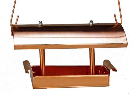 Copper Fly-Thru Bird Feeder features a simple linear design with two columns for a sleek appearance. The Pavilion lasts a lifetime while turning to a natural patina finish, may also be polished for long lasting bright shine. Complete with detachable copper hanger.