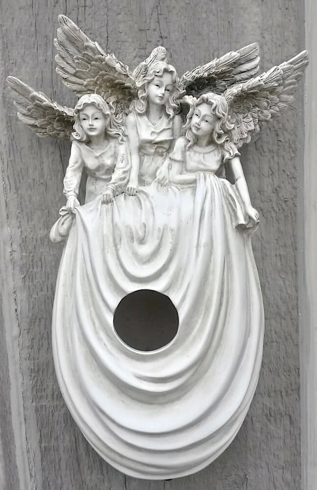 Graceful angelic birdhouse offers feathered friends a safe and cozy place to nest and raise their families with stunning style.
